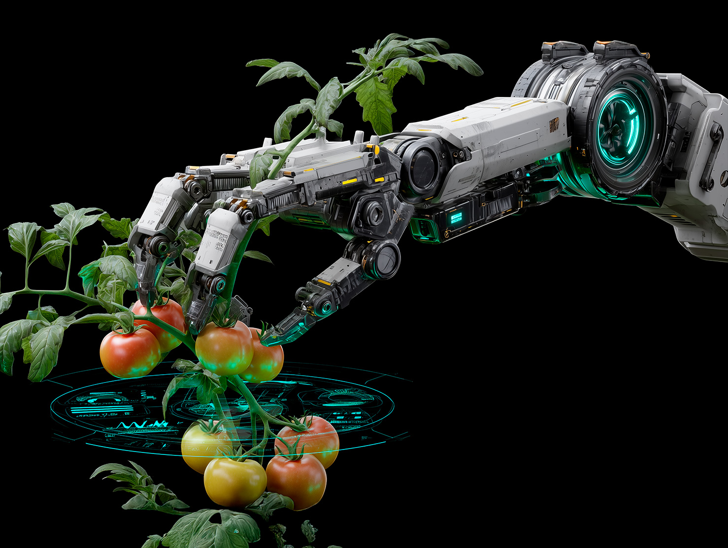 - Brazos robóticos con pinzas o sistemas de succión que recolectan el producto con cuidado, sin dañarlo.